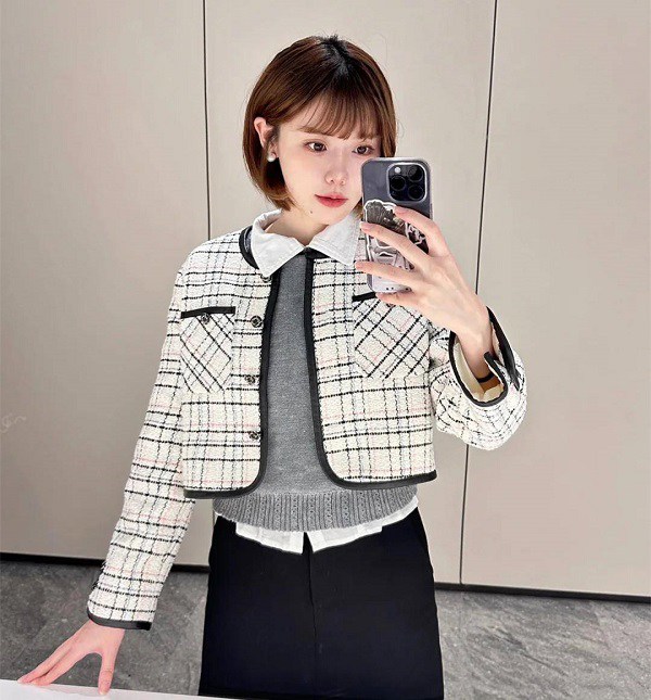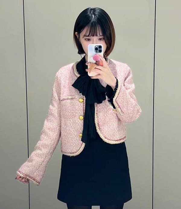 Các nàng có thể lựa chọn một chiếc áo khoác vải tweed màu hồng pastel.