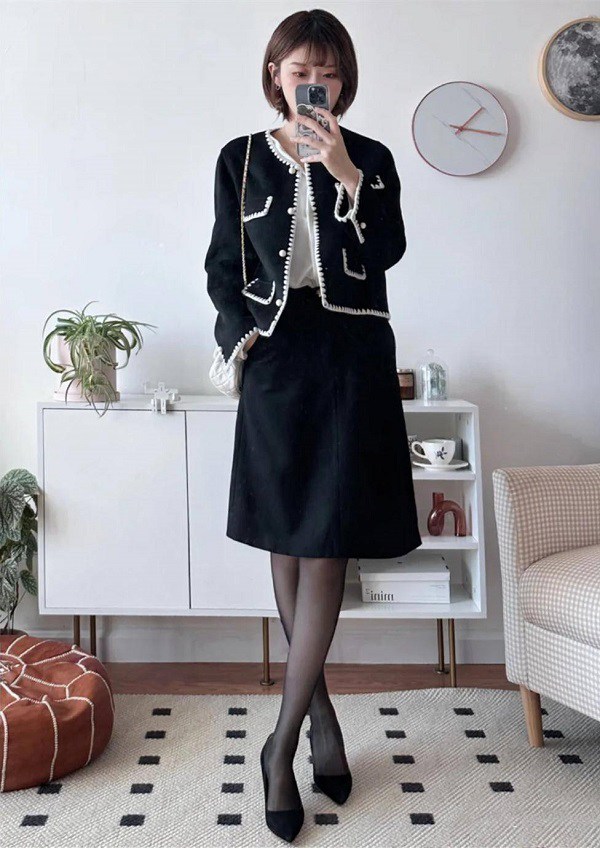 Set đồ đồng bộ gồm áo khoác và chân váy giúp các cô gái có một hình ảnh thanh lịch, nữ tính chốn văn phòng.