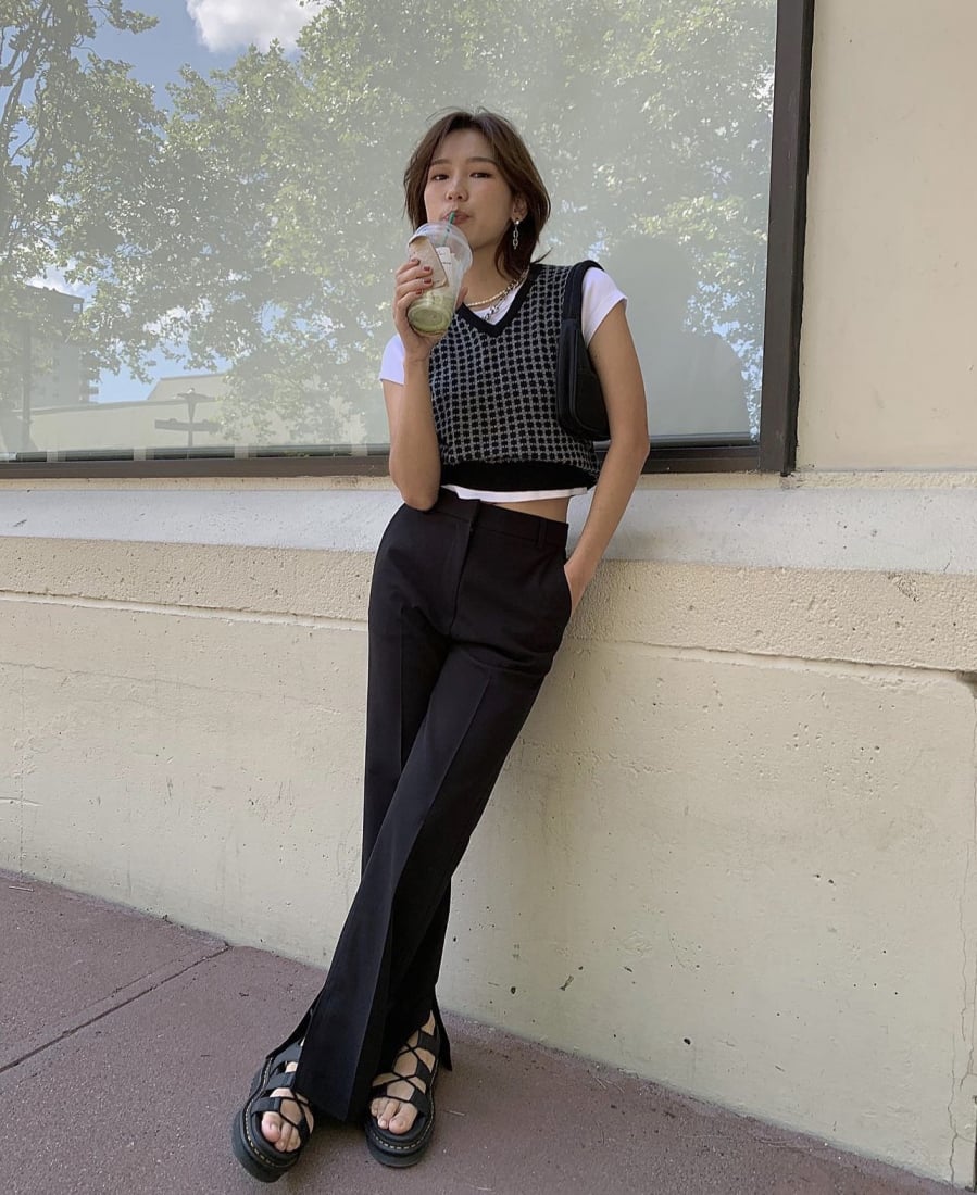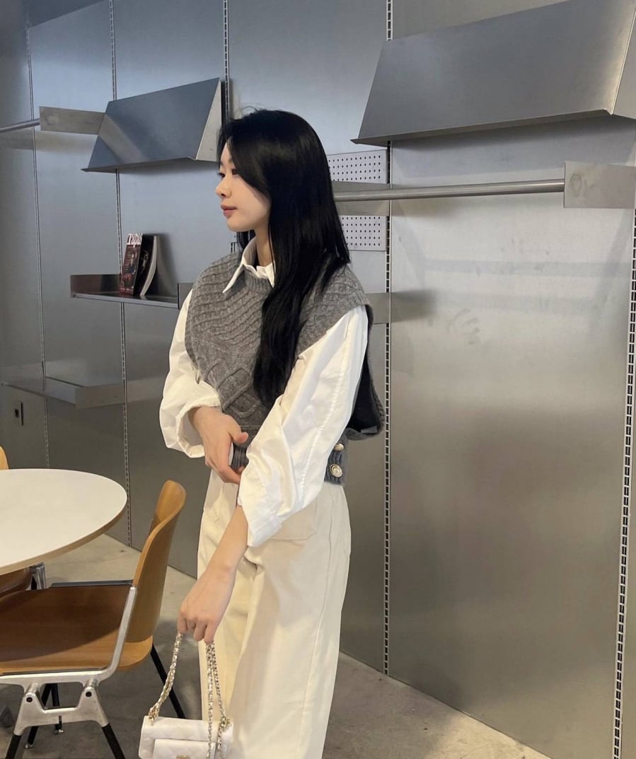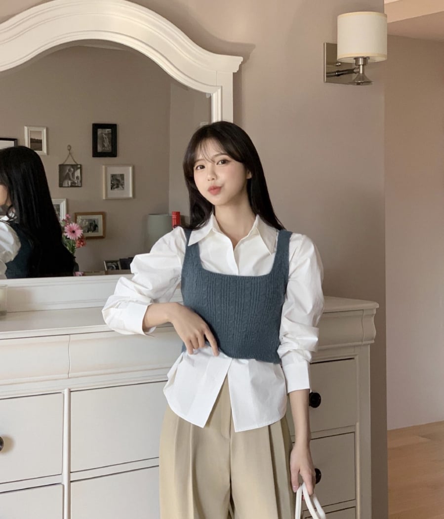 Một trong số những món đồ được kết hợp nhiều nhất với áo gile dệt kim chính là sơ mi và quần ống rộng. Dù đơn giản này nhưng vẫn giúp người mặc ghi điểm thanh lịch, nhẹ nhàng và có gu vô cùng.